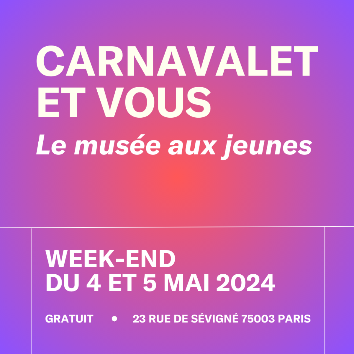 SAMEDI 4 ET DIMANCHE 5 MAI 2024 : UN WEEK-END FESTIF AVEC DES ANIMATIONS GRATUITES Le musée vous invite à la troisième édition de son week-end « Carnavalet et vous ». Spécialement pensé pour le public des jeunes adultes, ce week-end est placé sous le signe de l'engagement et du sensible.