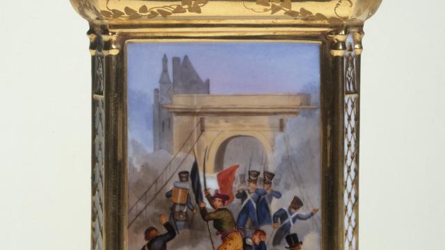 Le musée Carnavalet regorge d’objets de toutes sortes, qui, parce qu’ils sont petits, peuvent passer inaperçus. La tisanière-veilleuse exposée dans la salle Paris 1800-1848 ne fait pas exception à cette règle. Cet objet richement décoré et en partie doré à l’or fin, contient, sur l’une des trois faces de sa base, une peinture surprenante. On y voit une femme en pantalon au moment des journées révolutionnaires de juillet 1830 à Paris. Même si, à nos yeux, cette représentation (une femme révolutionnaire vêtue de cette manière) n’a rien de scandaleux, faire ce choix à ce moment-là de l’histoire est extrêmement rare. Les petits objets offrent peut-être des espaces de liberté esthétique et politique que certaines peintures d’histoire n’offrent pas...
