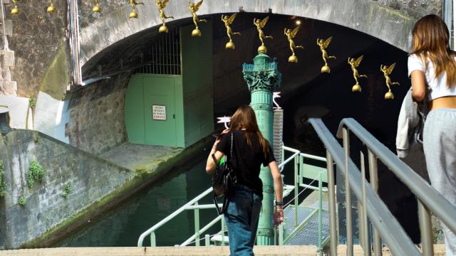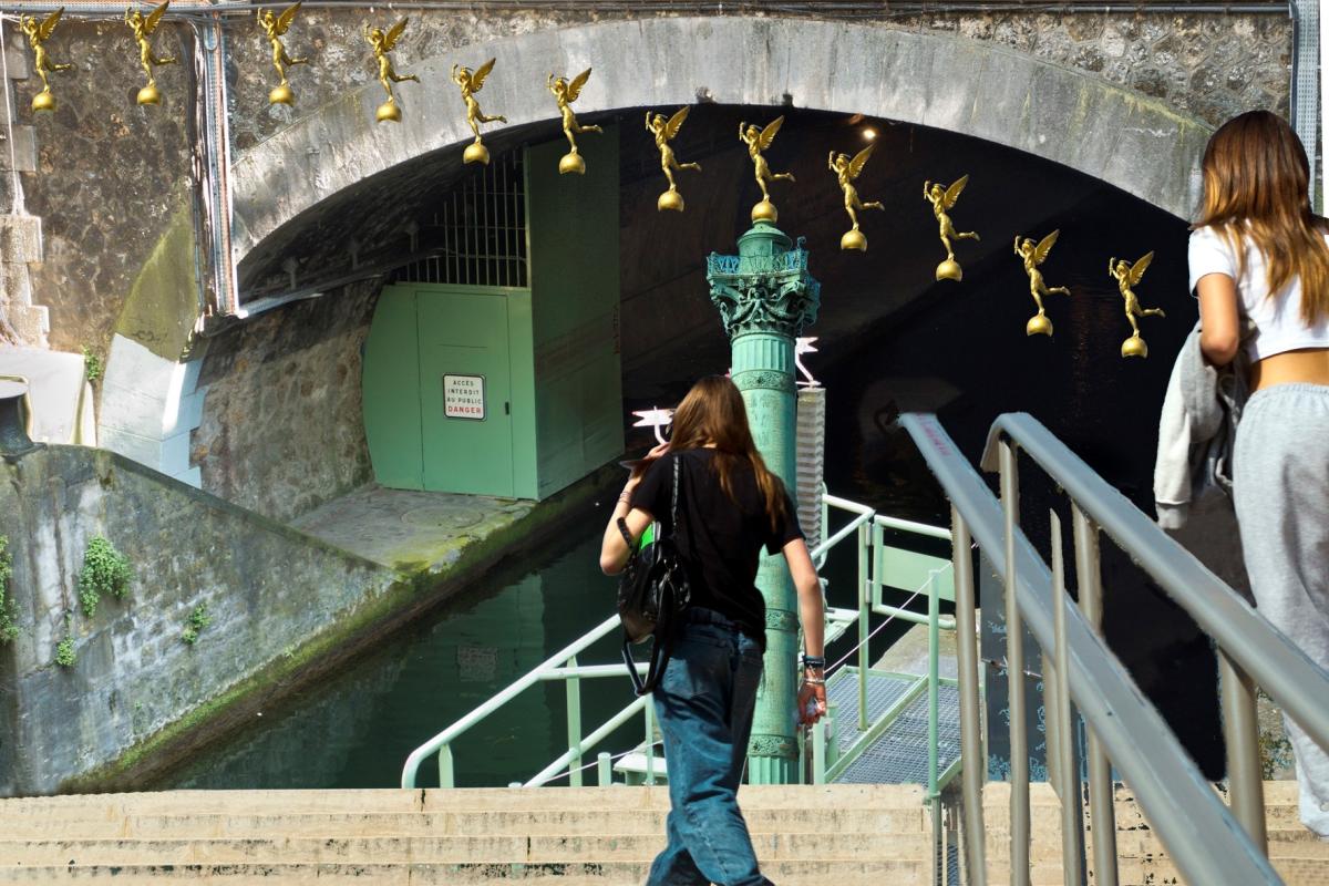 Puis nous cheminerons vers le canal Saint-Martin. Après la rencontre troublante de la rue de Rivoli et de la rue Saint-Antoine, nous rejoindrons d’abord le port de l’Arsenal et la place de la Bastille. « Nous ne naviguerons point sur l’eau, mais sur la terre ferme », est-il dit dans Gestes et opinions du docteur Faustroll, pataphysicien d’Alfred Jarry. À nous de mettre en pratique cette proposition et de naviguer au-dessus du canal en suivant le boulevard Richard Lenoir.