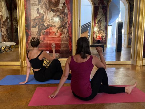 Au sein de l’étonnante salle de bal Wendel, lors d’une séance de yoga Iyengar, une intervenante accompagne les participants dans la mobilisation du corps et des sensations. Pour découvrir autrement ce décor flamboyant !