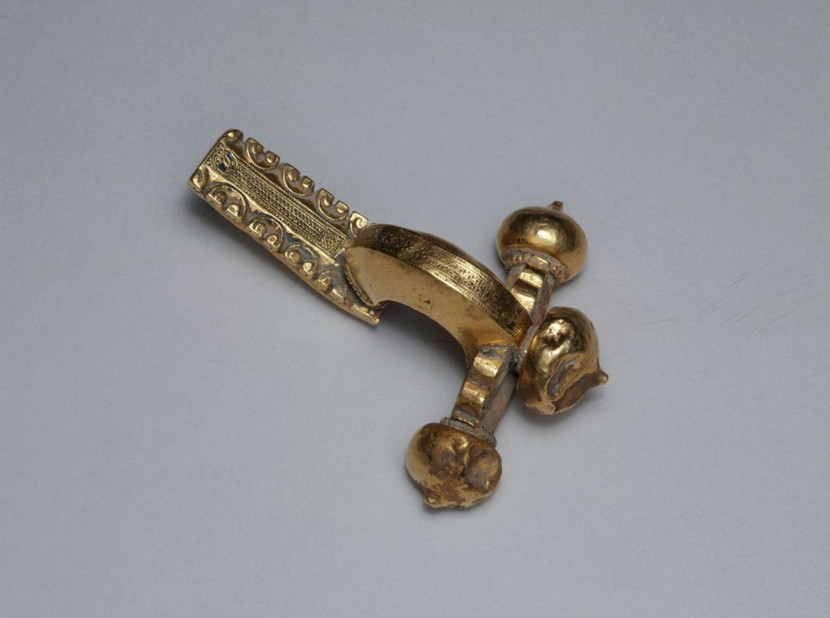 Ce modèle, de fabrication très soignée, est dit « à tête d’oignon » ou « cruciforme ». Aux extrémités, trois minuscules médaillons à bustes masculins sont gravés avec finesse dans la tôle d’or.La fibule cruciforme, caractéristique de l’Antiquité tardive, était portée par des dignitaires de haut rang, membres de la cour impériale, hauts fonctionnaires de l’administration, militaires, officiers et vétérans de l’armée. Elle devient même une distinction officielle dans la seconde moitié du 4e siècle.À cette époque, la frontière septentrionale de l’Empire romain est menacée par les peuples voisins et l’armée prend position dans de nombreuses villes de Gaule du Nord. Le cantonnement de ces troupes a laissé des traces à Lutèce comme des éléments de panoplie militaire, boucle et fibules. La plupart proviennent de tombes, hormis cet exemplaire unique, en or, retrouvé dans la Seine.