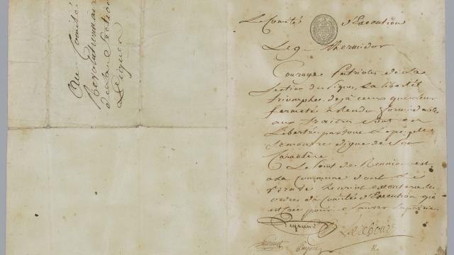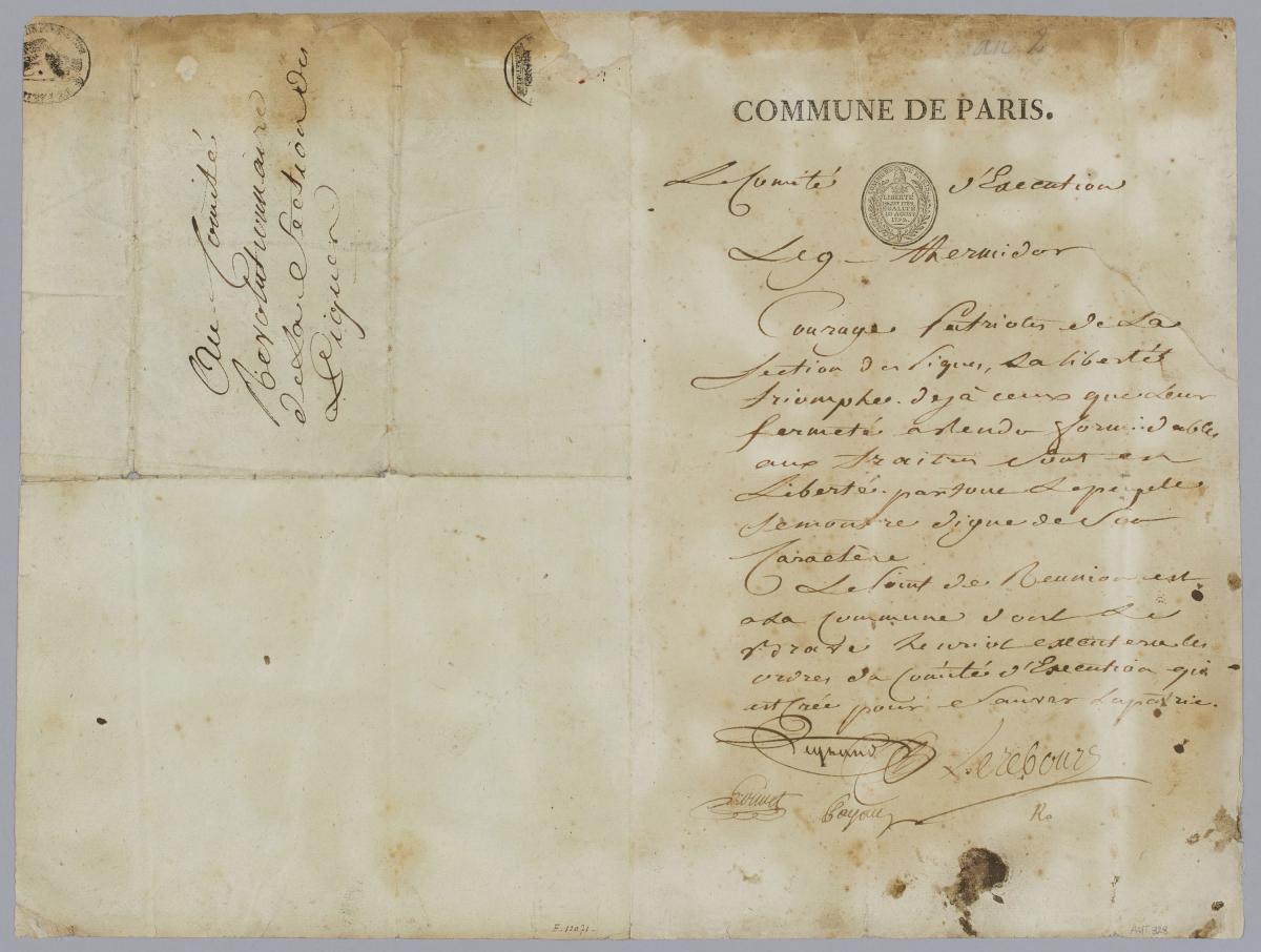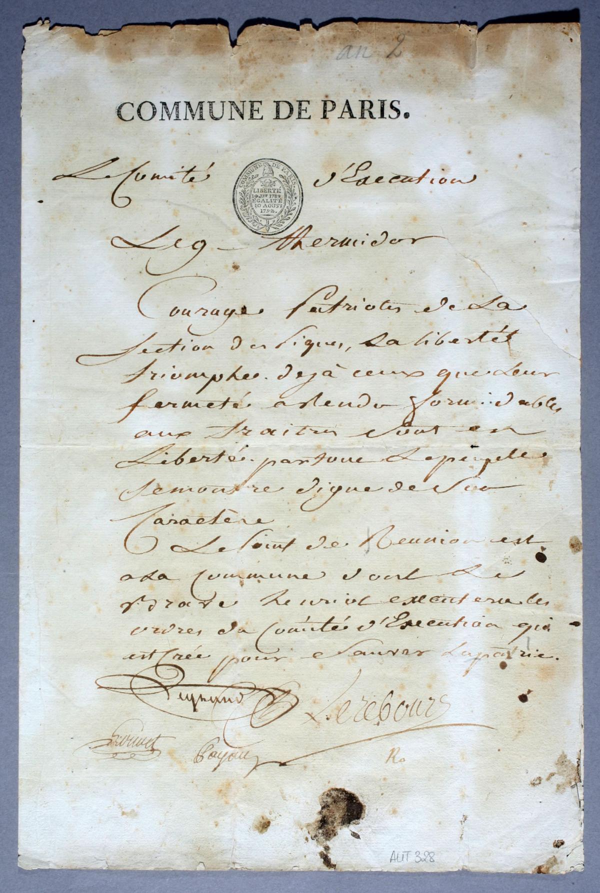La firma interrumpida «Ro», todavía sin explicación hoy en día, ha suscitado durante mucho tiempo una lectura un tanto dramática de este documento, como último mensaje de Maximilien Robespierre antes de la llegada de las tropas de la Convención para arrestarle. Esta orden es, de hecho, uno de los primeros actos del comité de ejecución de la Comuna de París, reunido en torno a Robespierre en el ayuntamiento. Fue redactada en la tarde del 9 de Termidor, algunas horas antes del arresto, cuando la situación todavía no parecía desesperada. Sin embargo, la esperada movilización de las secciones parisinas no tuvo lugar y las tropas de la Convención entrarían sin resistencia alguna en el ayuntamiento a las 2 de la mañana. Robespierre fue guillotinado ese mismo día.