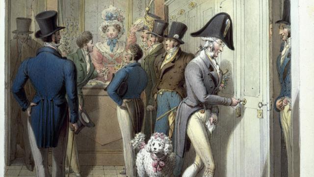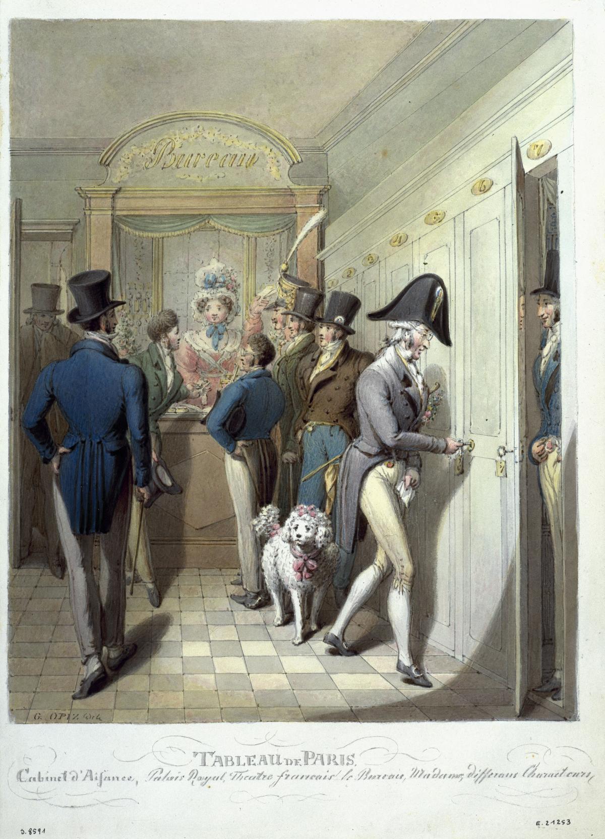 Los Tableaux de différents mœurs et costumes de Paris (Cuadros de los diferentes usos y costumbres de París) son una secuencia de acuarelas compuestas tras el retorno del artista a Alemania, en 1831, tomando como base los recuerdos de su estancia parisina. En este caso, es el animado ambiente de un lugar poco representado, la entrada al Cabinet d’aisance del Teatro francés (La Comédie-Française), el que atrae su atención, en especial, por la diversidad de personajes e indumentarias.