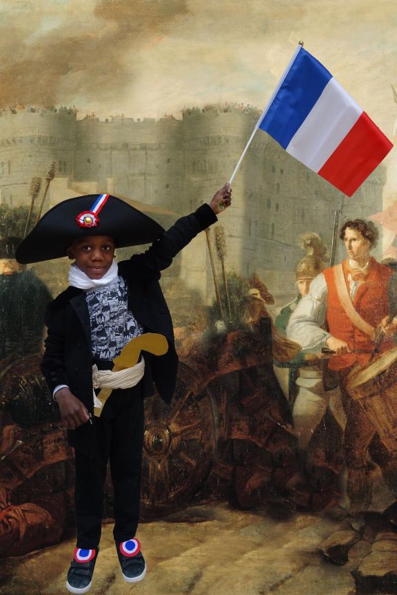 Pour le projet « Sur les chemins de la liberté », des enfants accompagnés par l’association Arsmedia ont confectionné des costumes de révolutionnaires. Ils ont pris la pose pour des portraits photographiés qui ont été insérés dans l’œuvre « Portrait d’un vainqueur de la Bastille ».